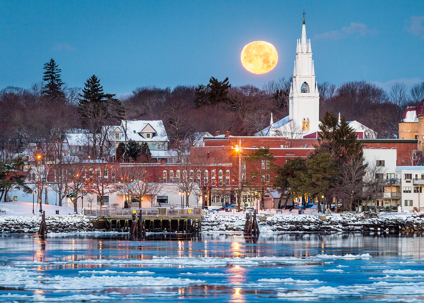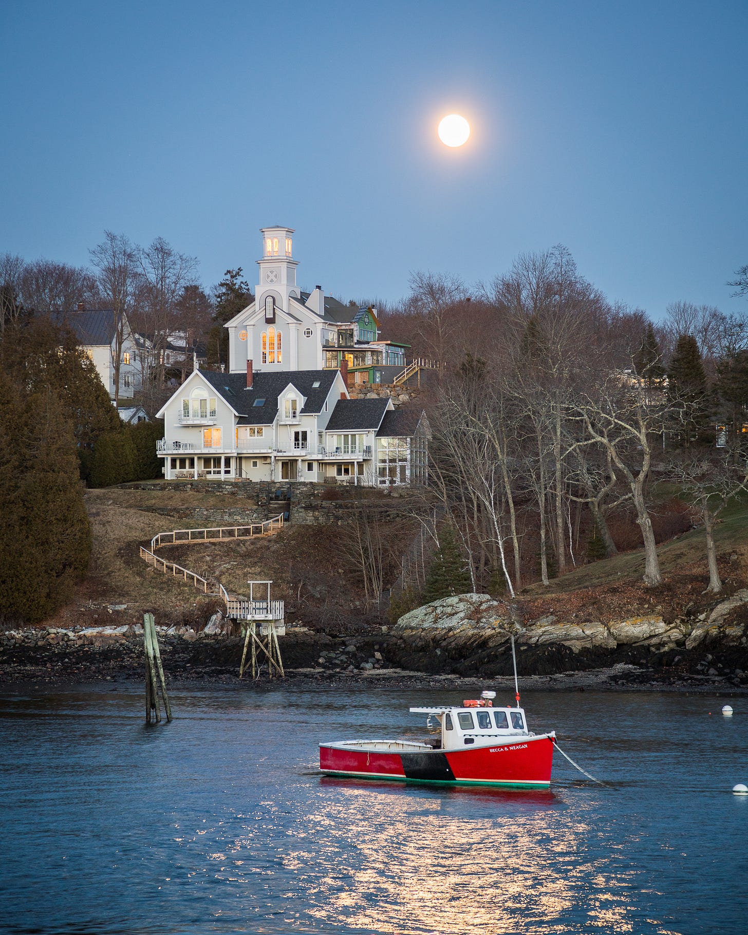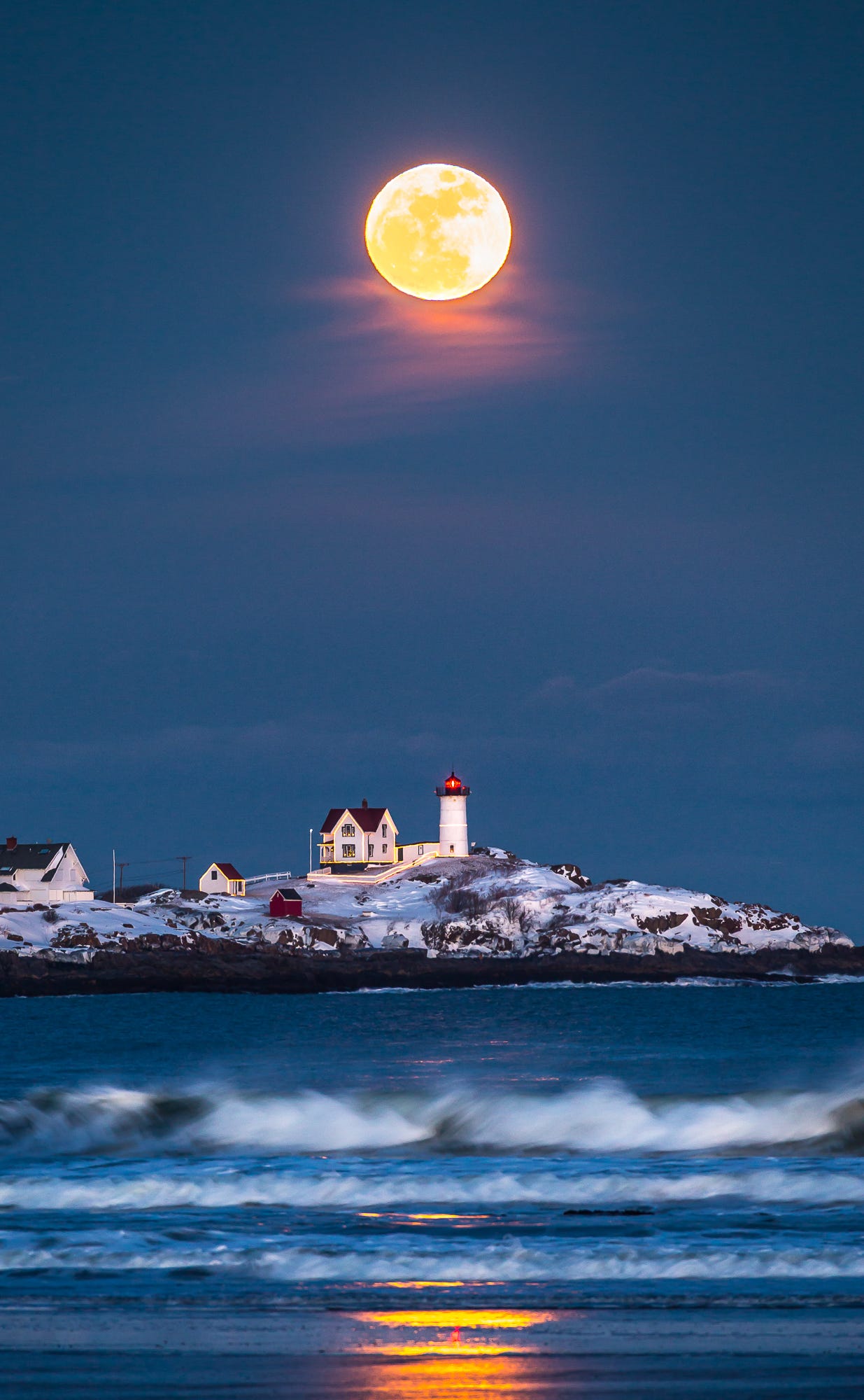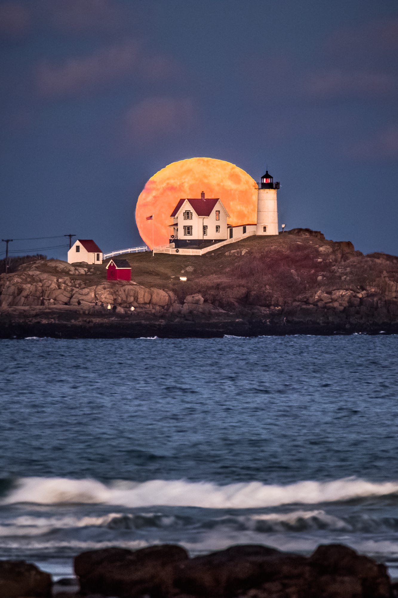 It helps to stand far away from the landmark you are trying to capture, and use a zoom lens to make the moon appear much larger in relation to the landmark. That’s where most of the dramatic impact comes in these photos. For the image above, I was about a mile away from Nubble Lighthouse on Long Sands Beach.