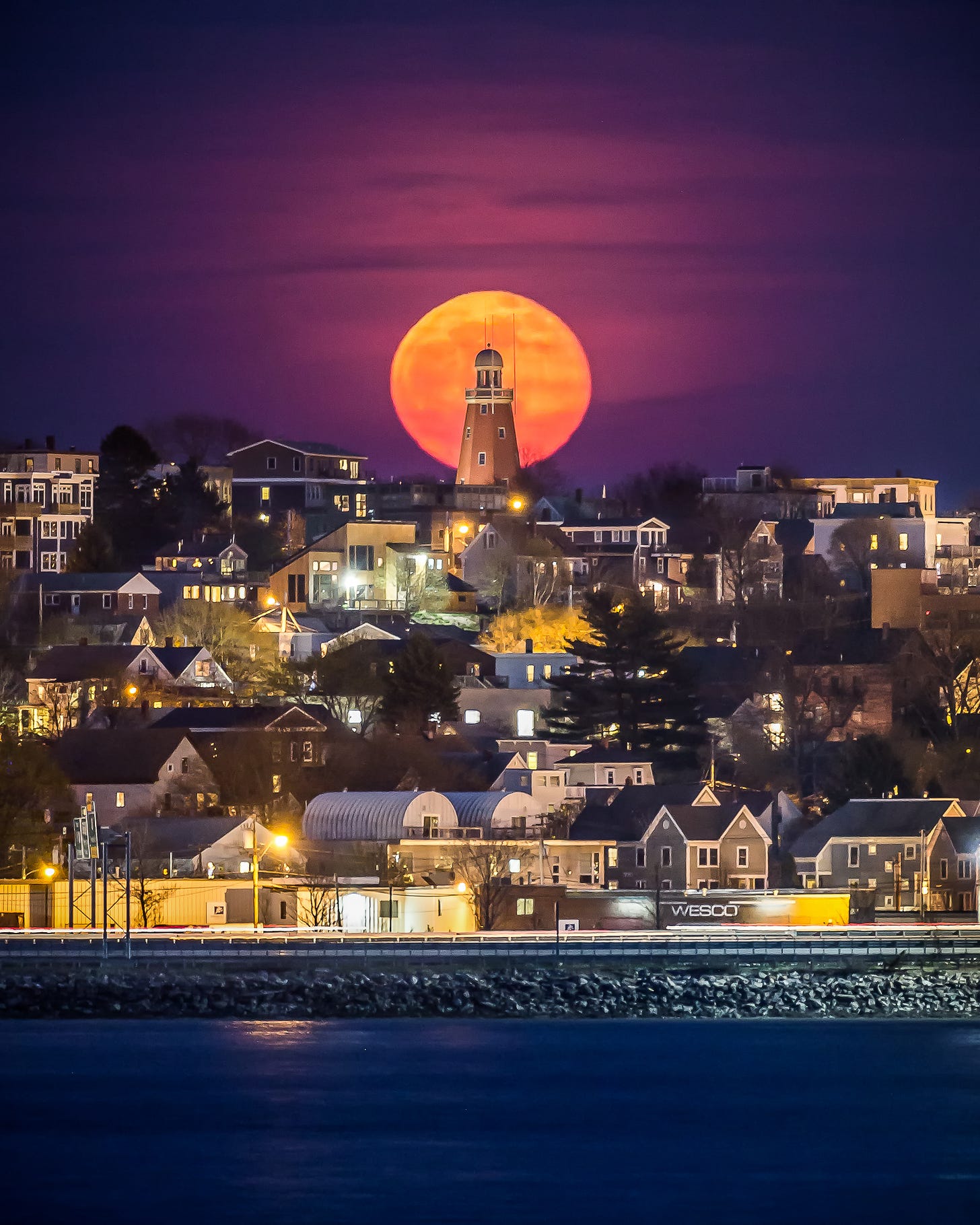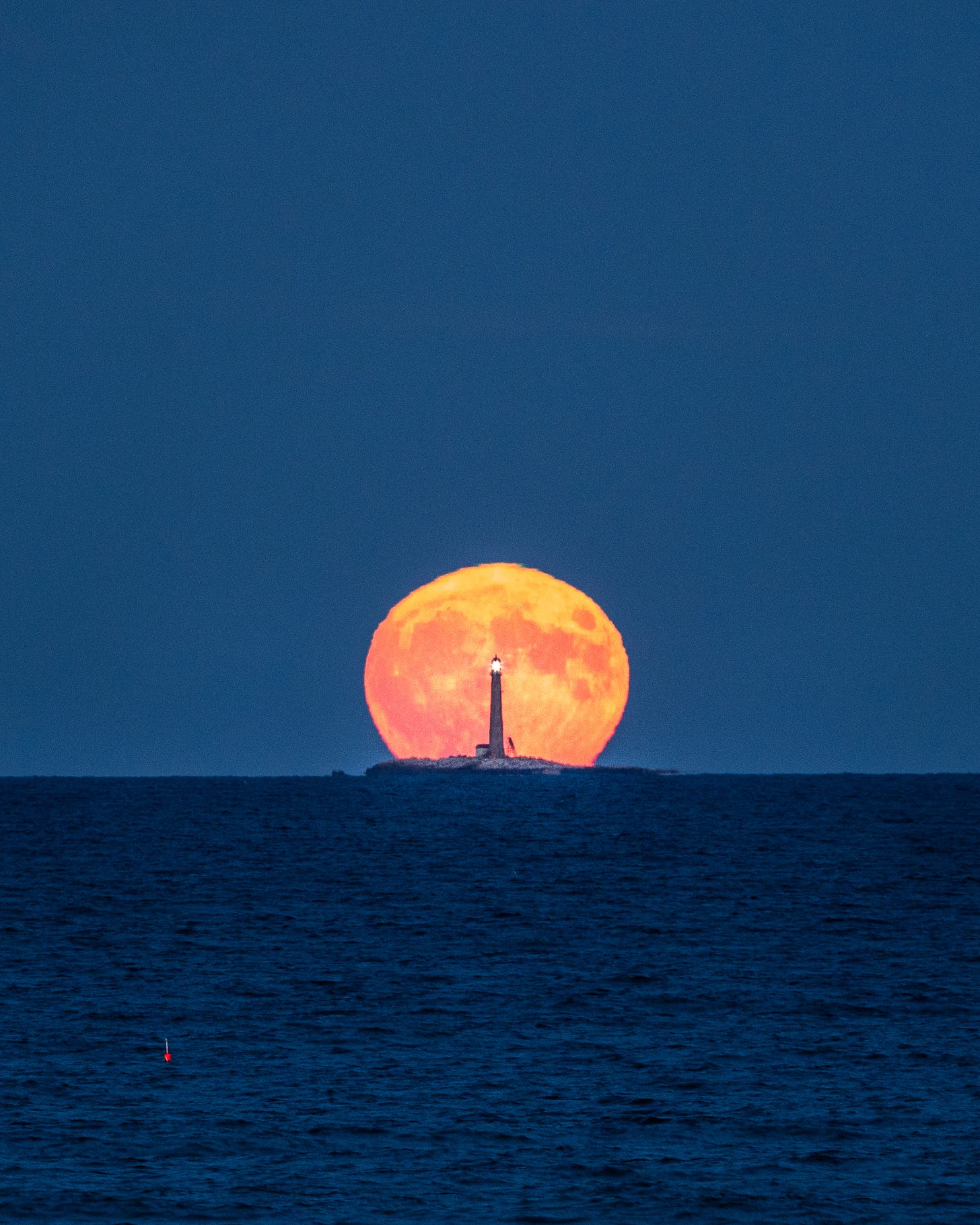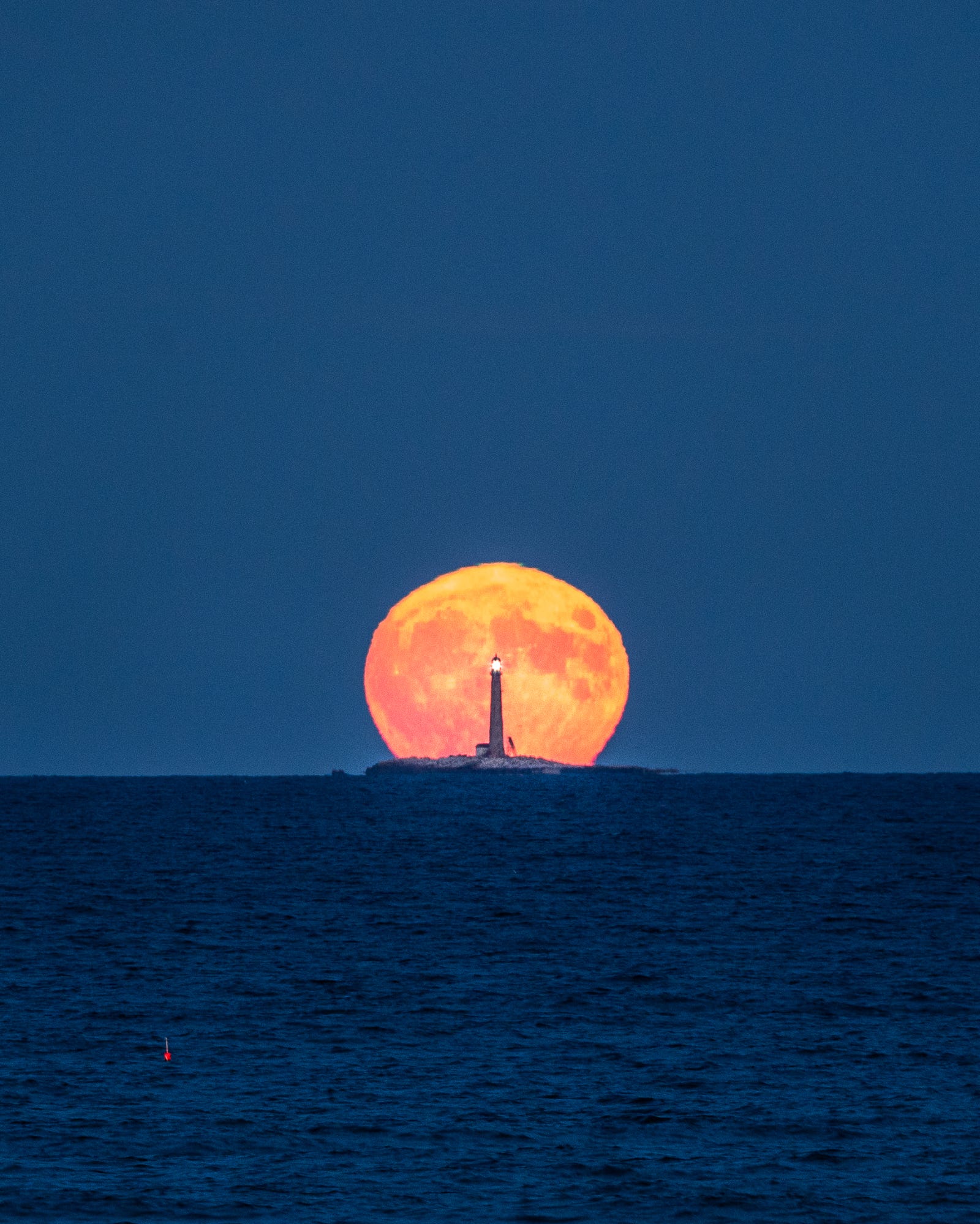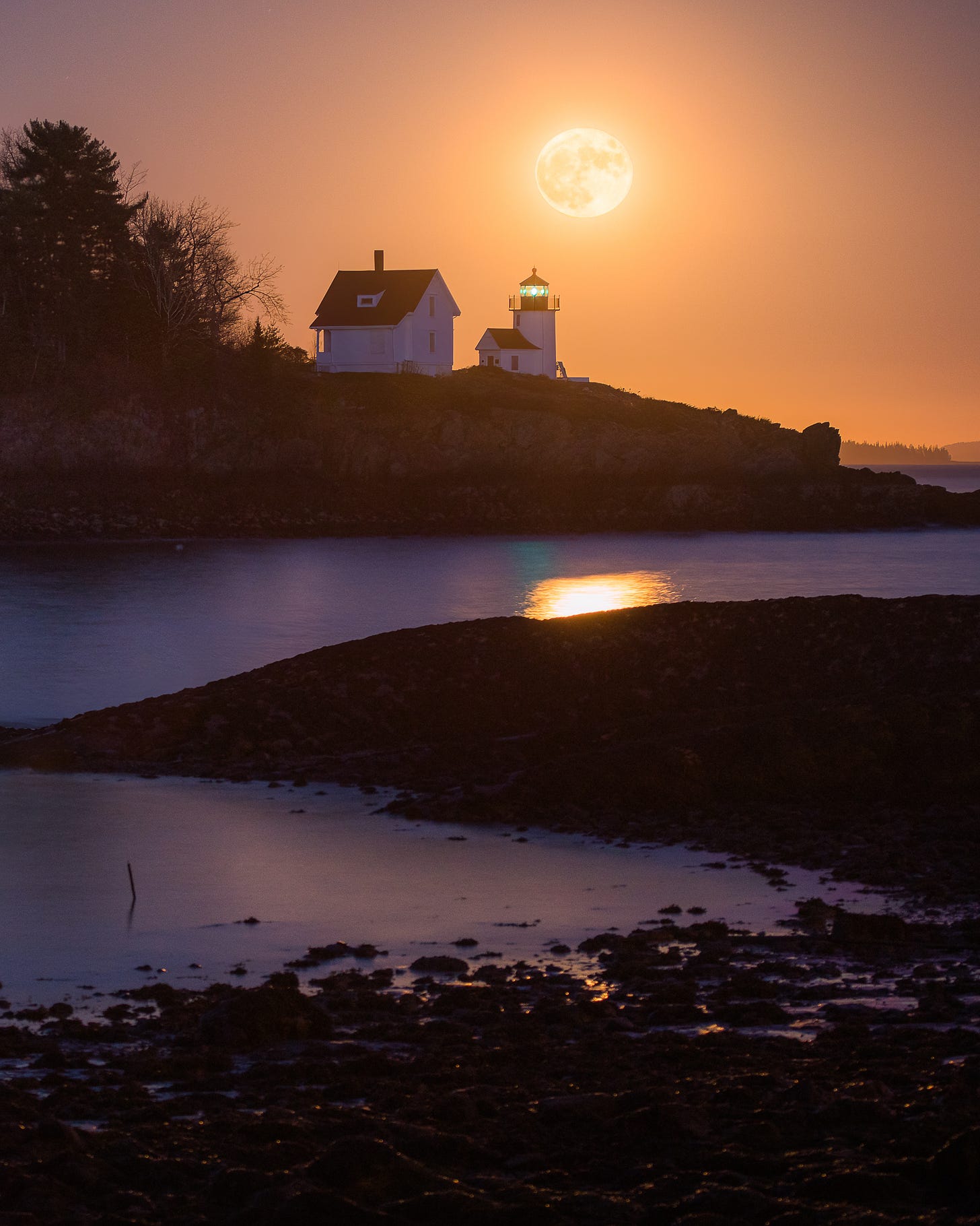 Heads-up: the moon moves up and right fast in the northern hemisphere, so step left to keep it framed with the lighthouse as it rises. Once you get an idea of where the moon is, you can move around and adjust your framing until you have the moon right where you want it.