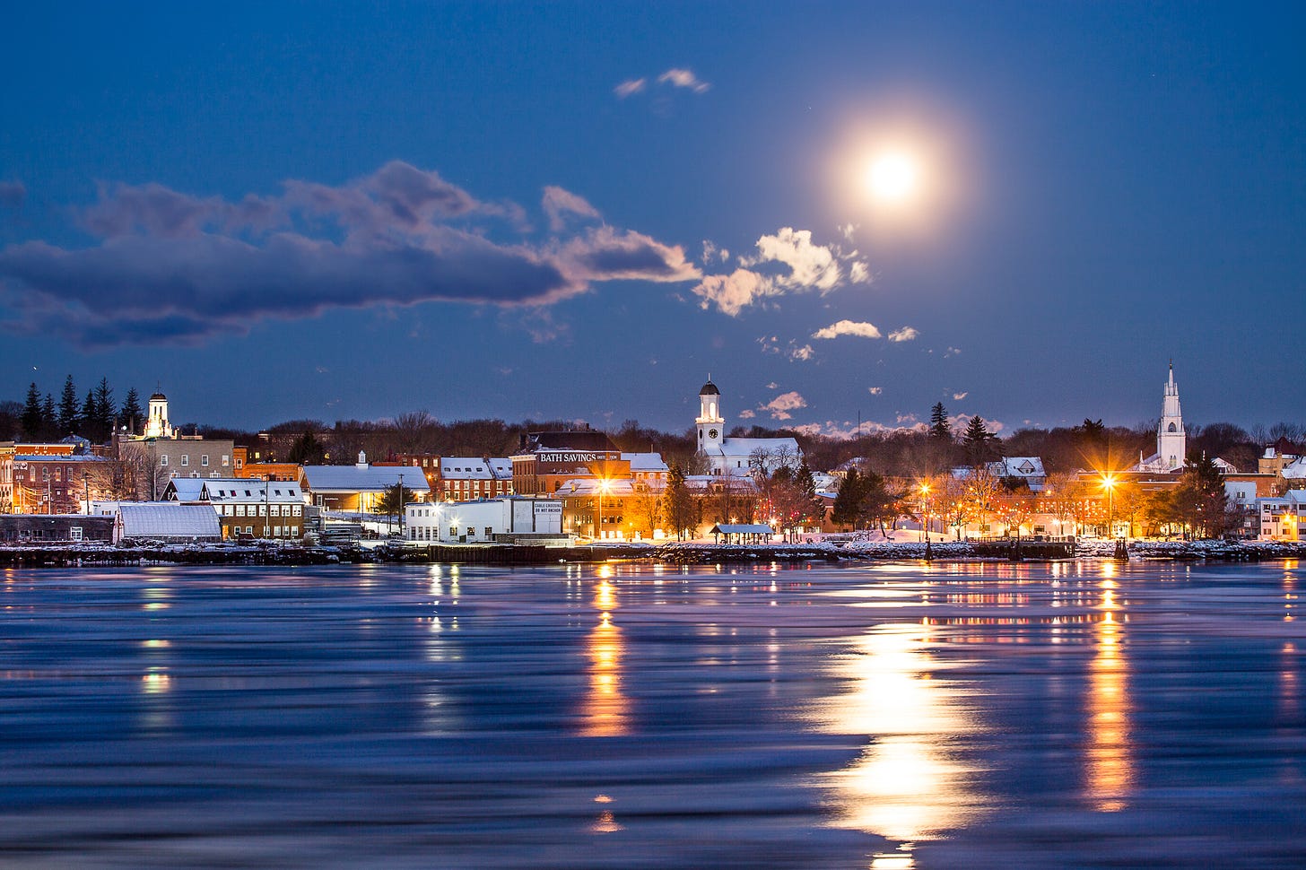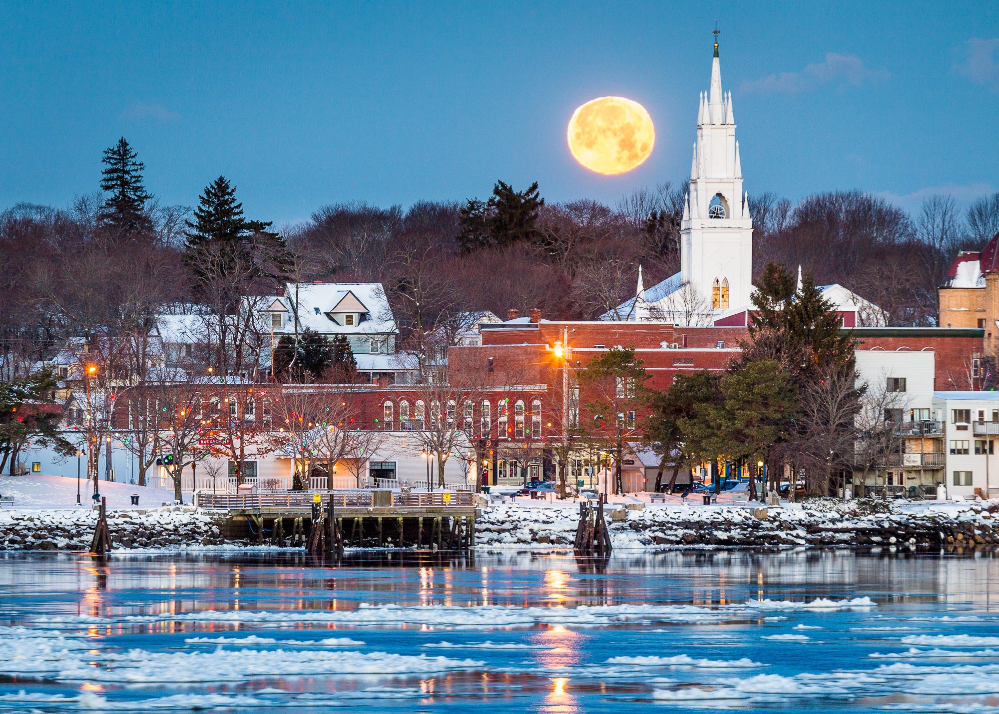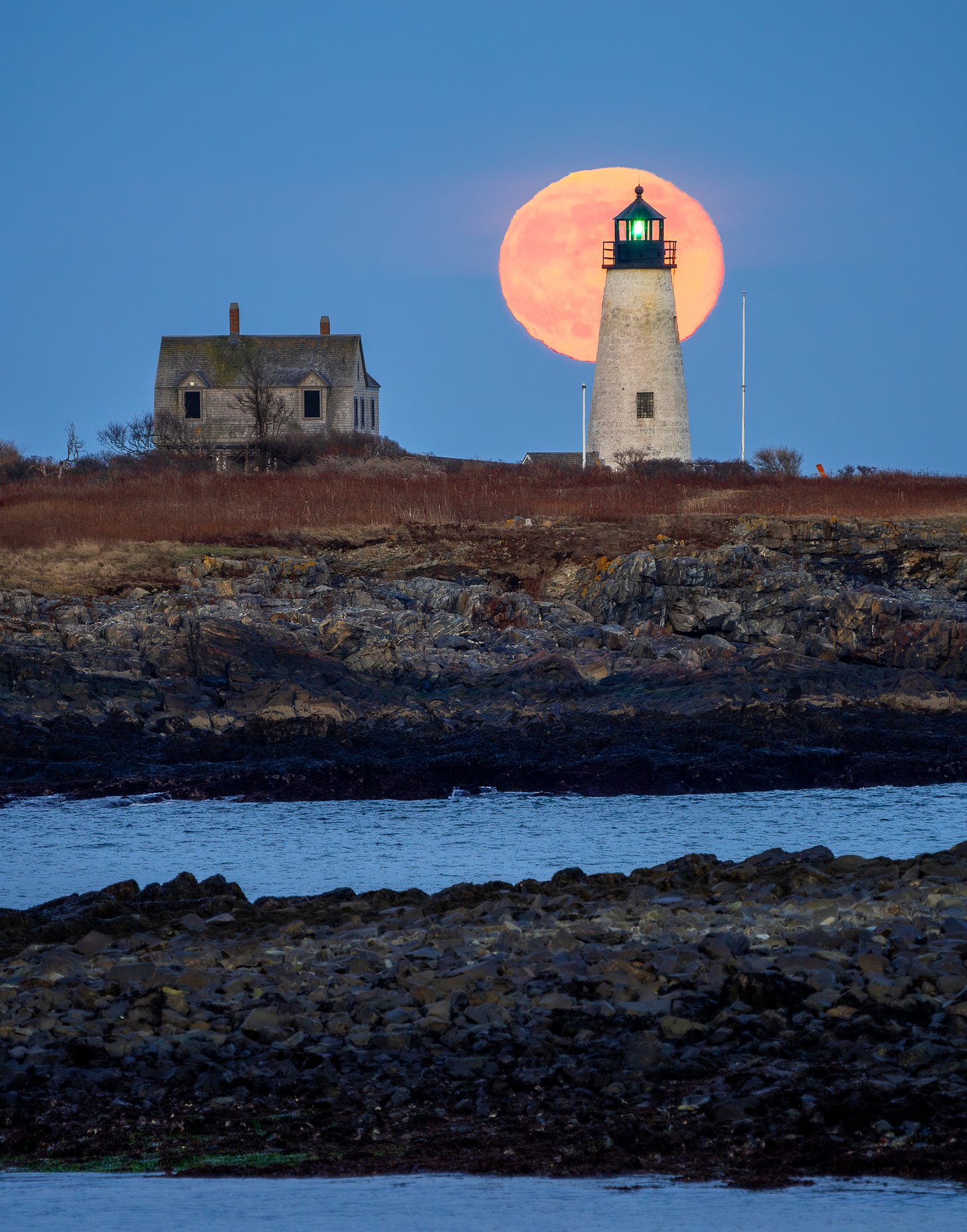 Let’s plan for March 14’s full moon rising behind Whaleback Lighthouse from Fort Stark in Newcastle, NH—one of the few public spots for this well-known lineup. I can’t guarantee that there won’t be any clouds on March 14, nor if I’m venturing onto private property at this location I’ve pinpointed just north of the parking lot for Fort Stark. That remains to be seen! This is for demonstration purposes.