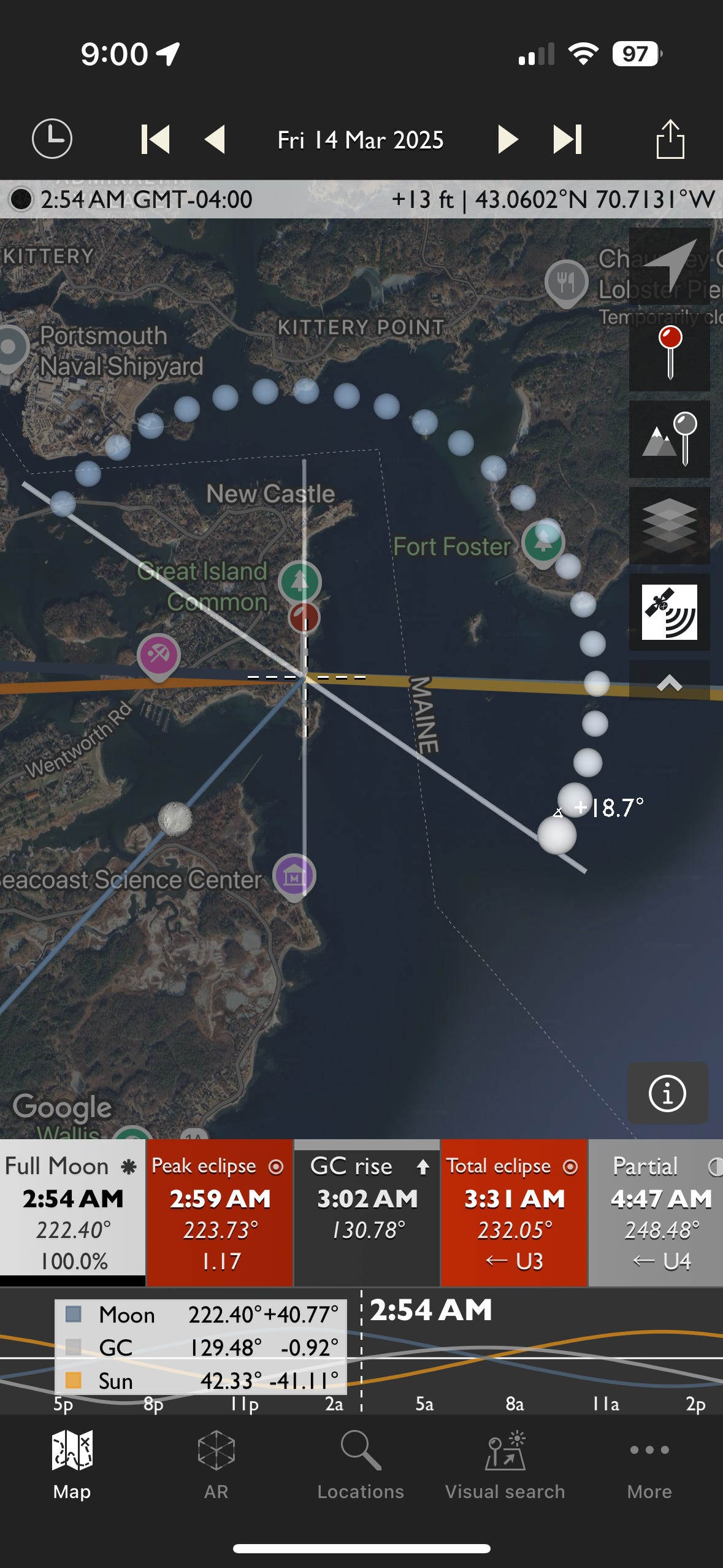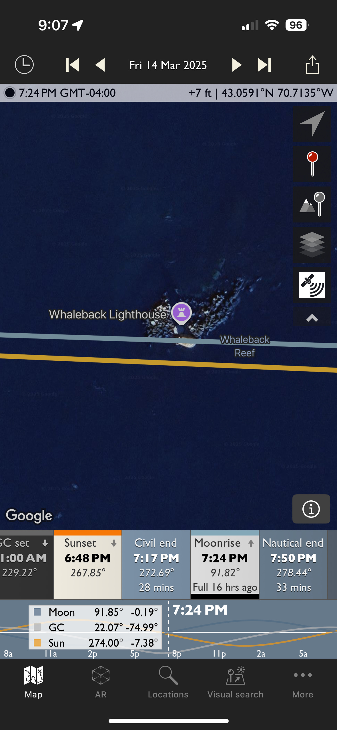Tweak the red pin until that blue line cuts through Whaleback Lighthouse. When that’s lined up, your red pin is where you’ll want to stand for the start of moonrise.