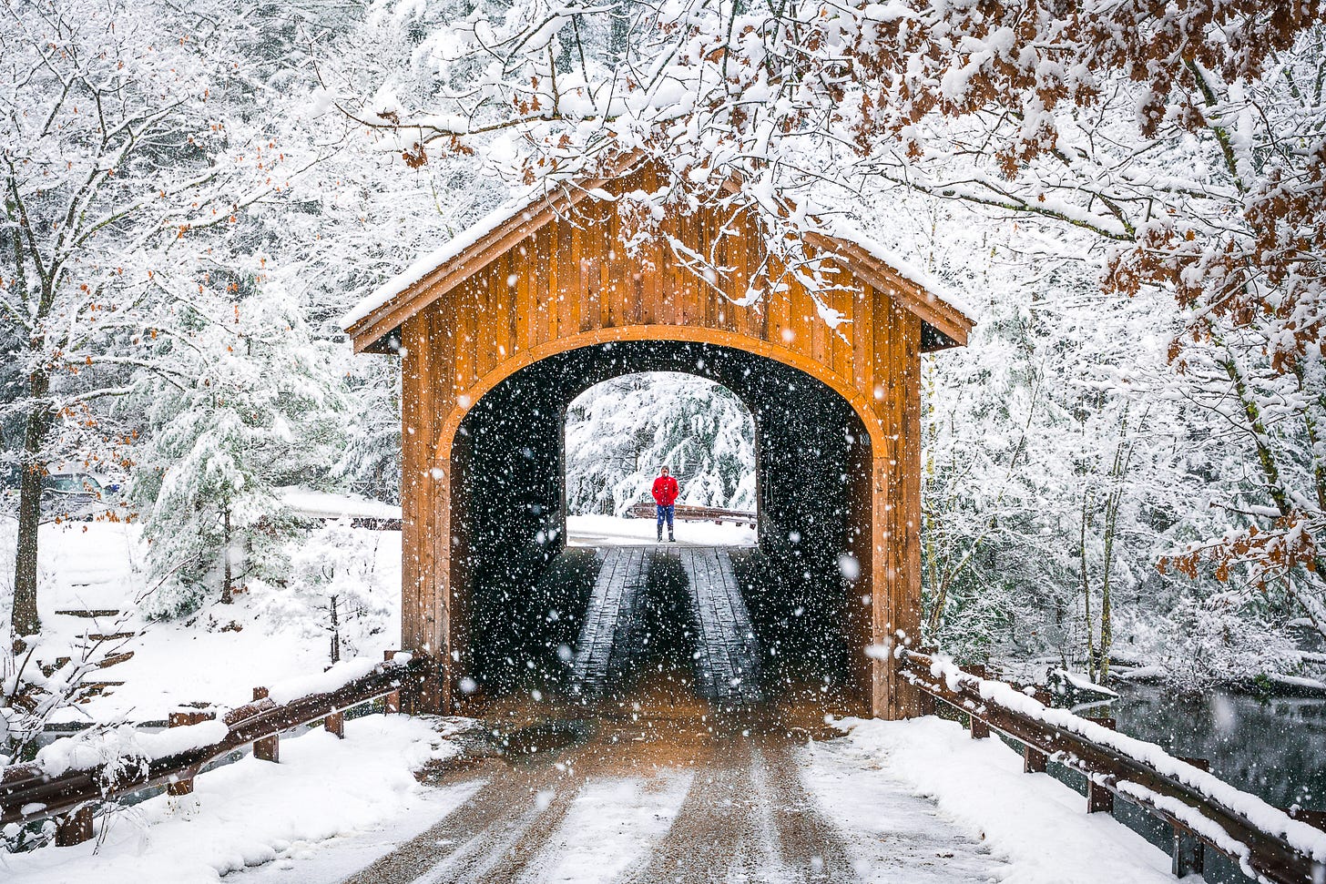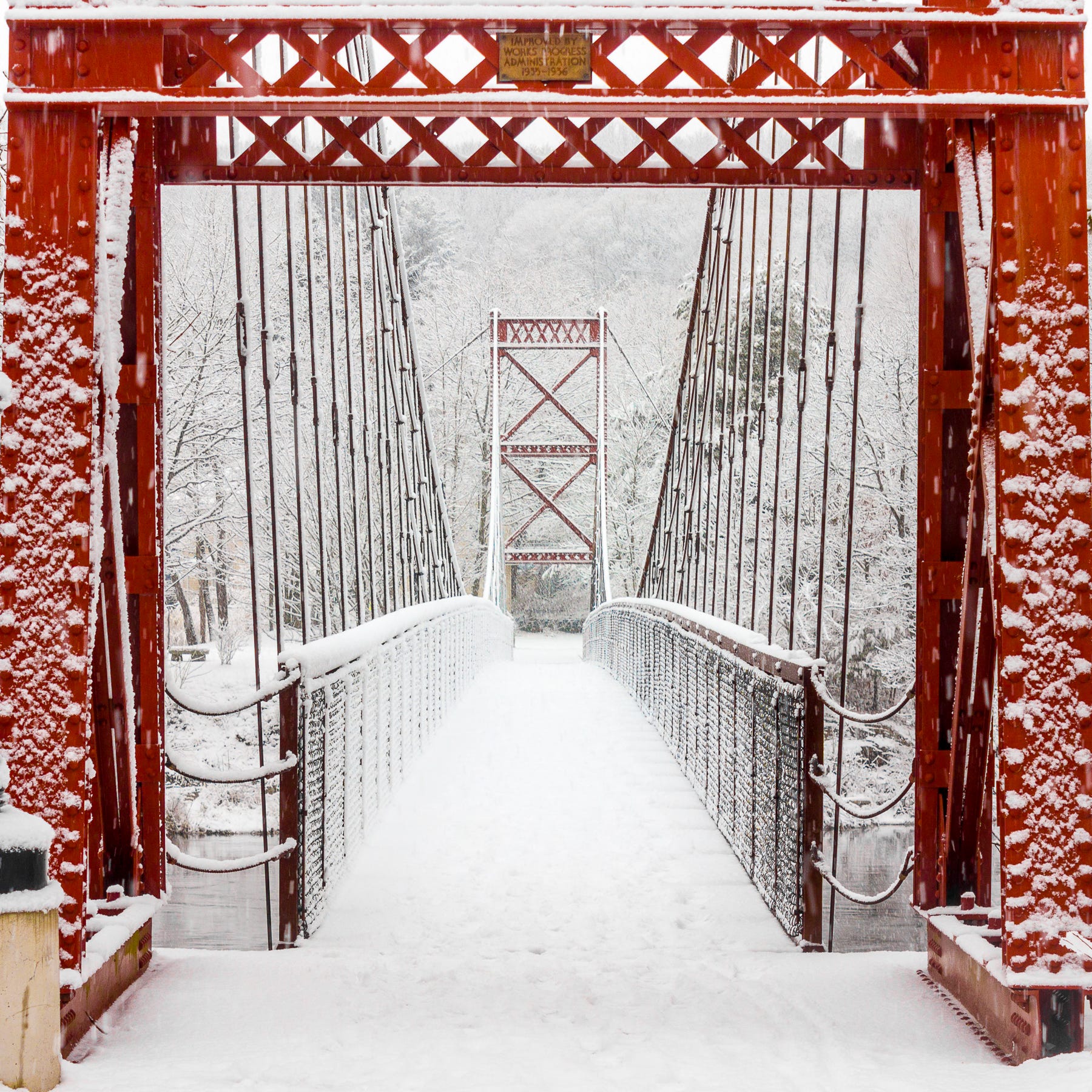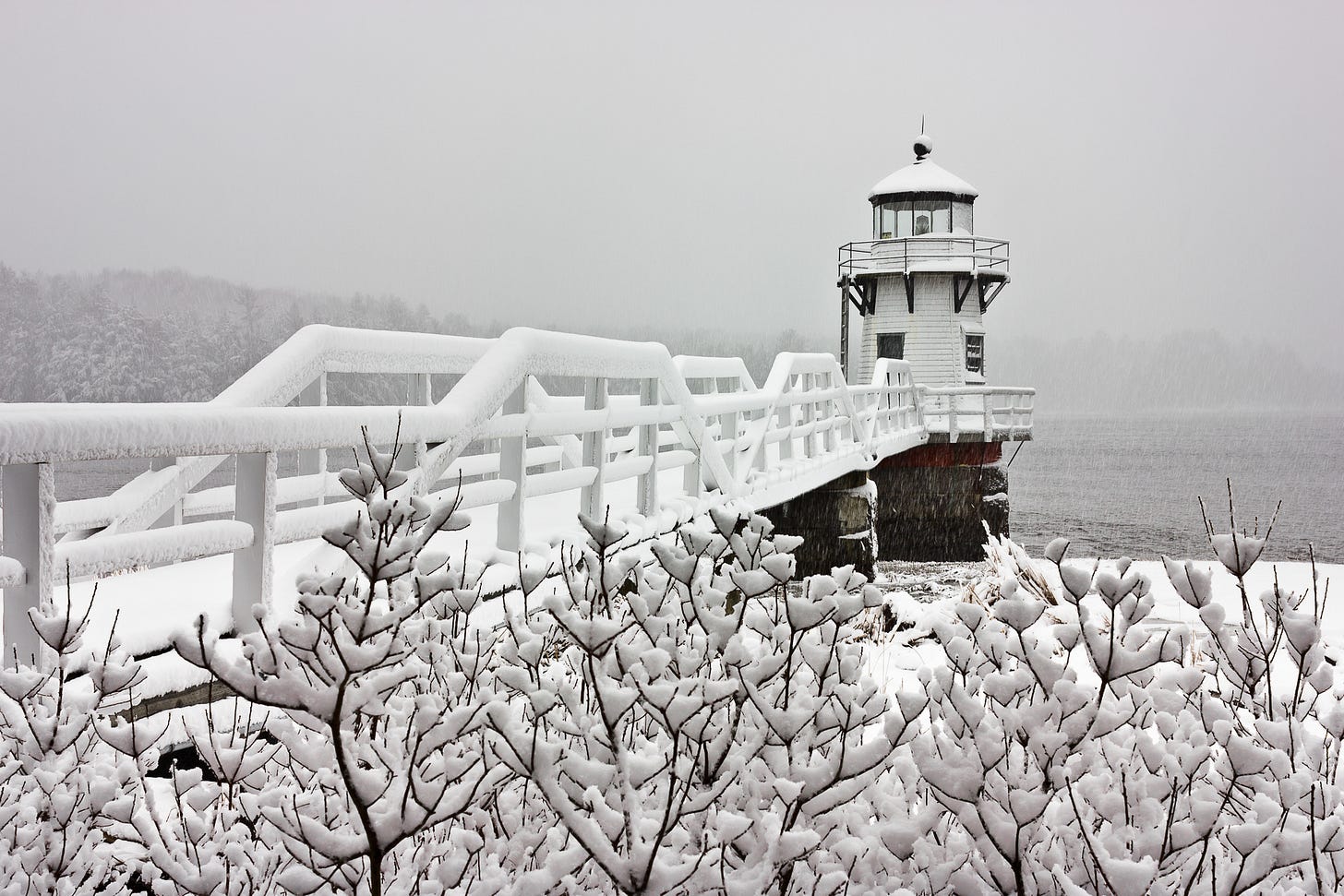The Swinging Bridge connecting Brunswick and Topsham is usually a tricky subject to photograph. In this image, snow covered the trees in the background to such an extent that they render mostly white, and the structure of the bridge stands out much more prominently. Also, the lack of color in the surrounding landscape really makes the red pop.