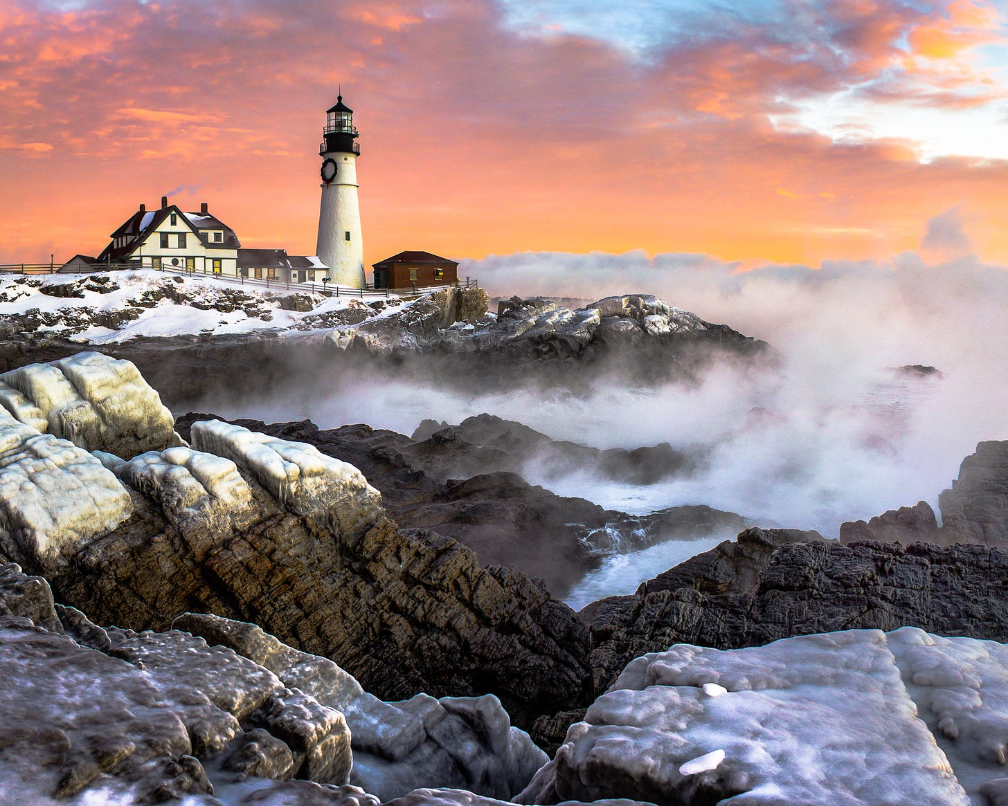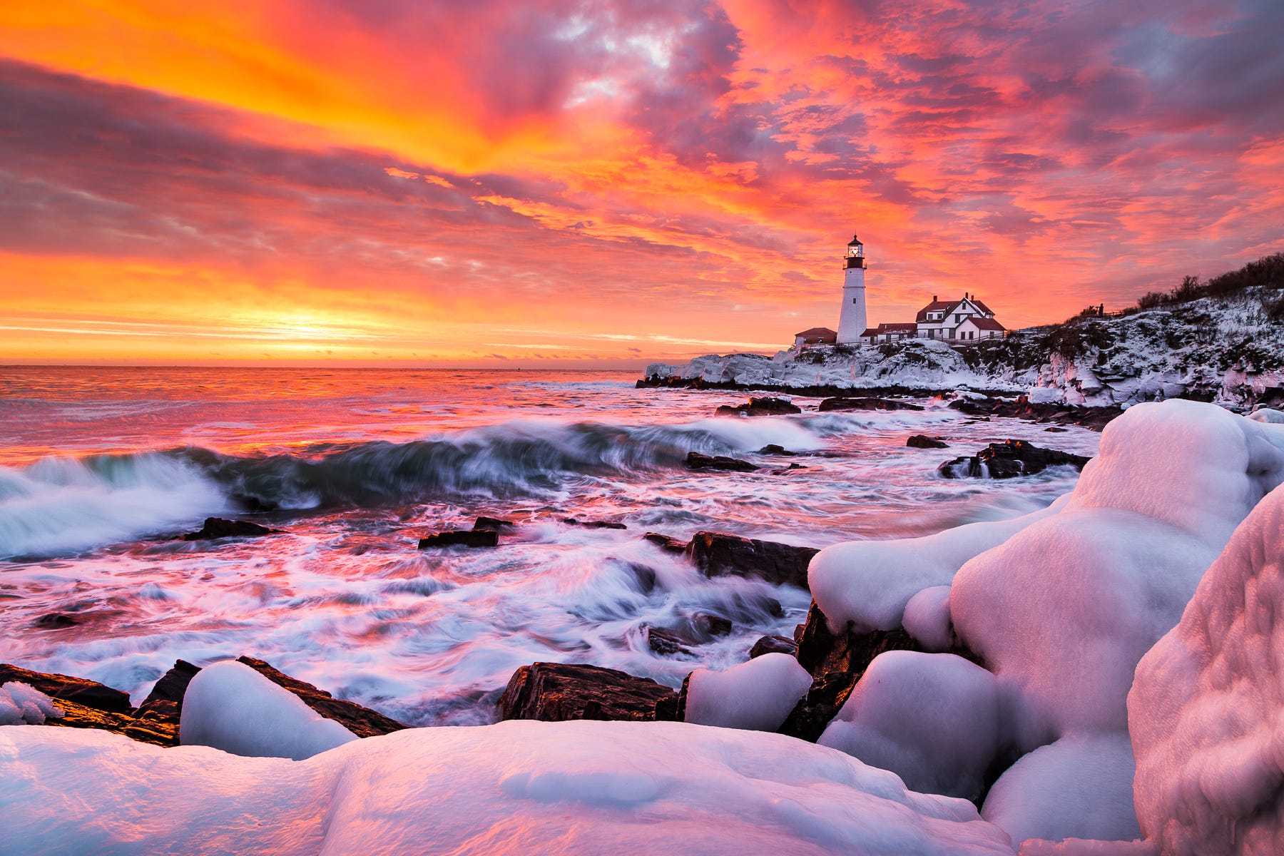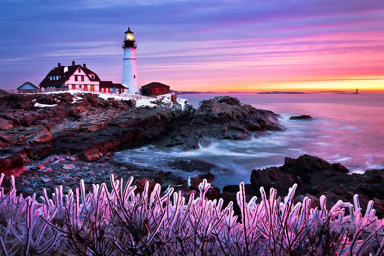 Conditions like these are incredibly rare, but do happen. A previous storm at Portland Head Light coated the shrubs in the foreground in frozen sea spray. Two days later, a colossal sunrise filled the sky with these incredible colors and illuminated the ice.