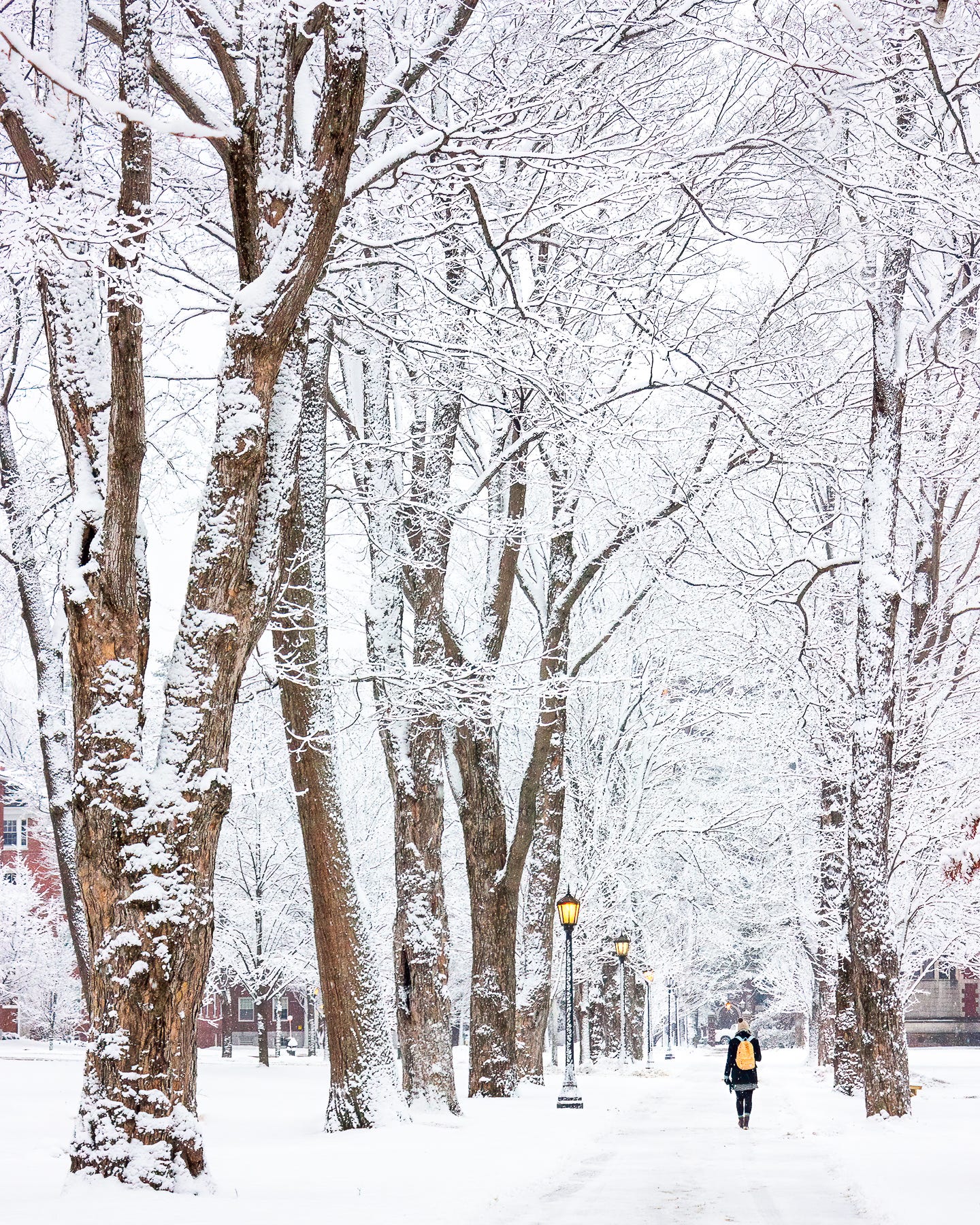 Urban environments can look great in winter, too. I loved this scene, taken on the campus of Bowdoin College, as a student walks down a path lined with colossal trees pasted in beautiful white snow.