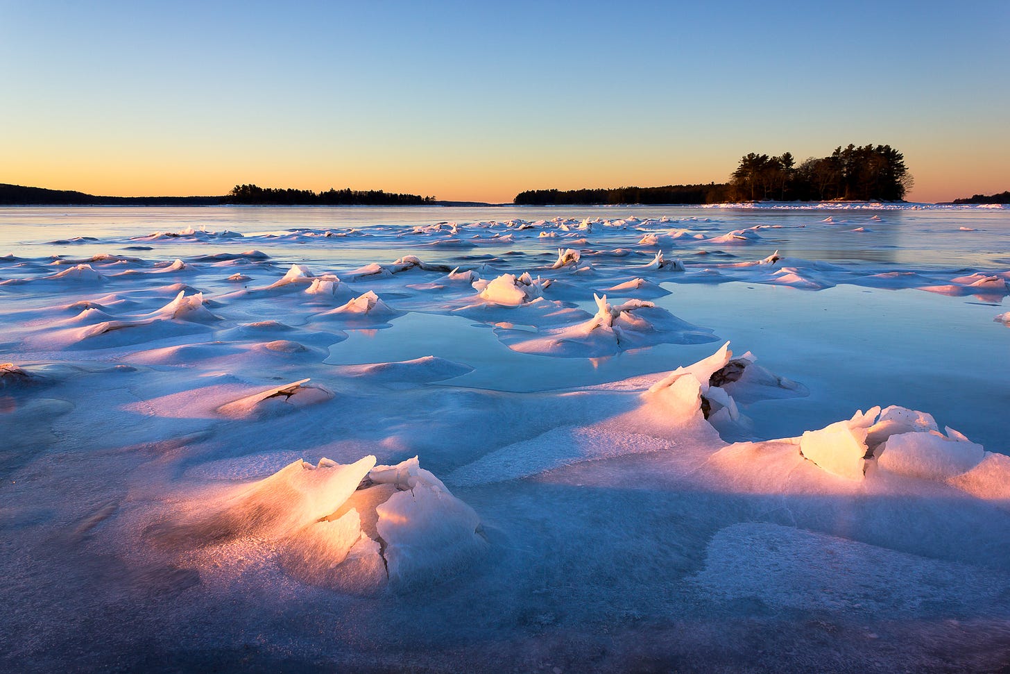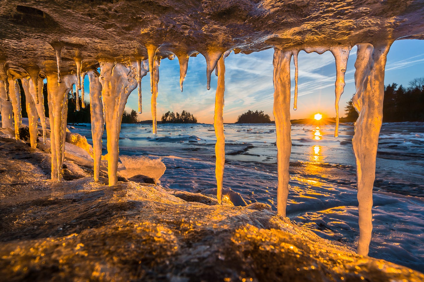 To get this perspective, I wedged my camera into a small crevice between two large ice blocks that were pushed up by the tide. Melting ice created some fantastic icicles, and waiting until sunset created the beautiful light and warm/cool color contrast.