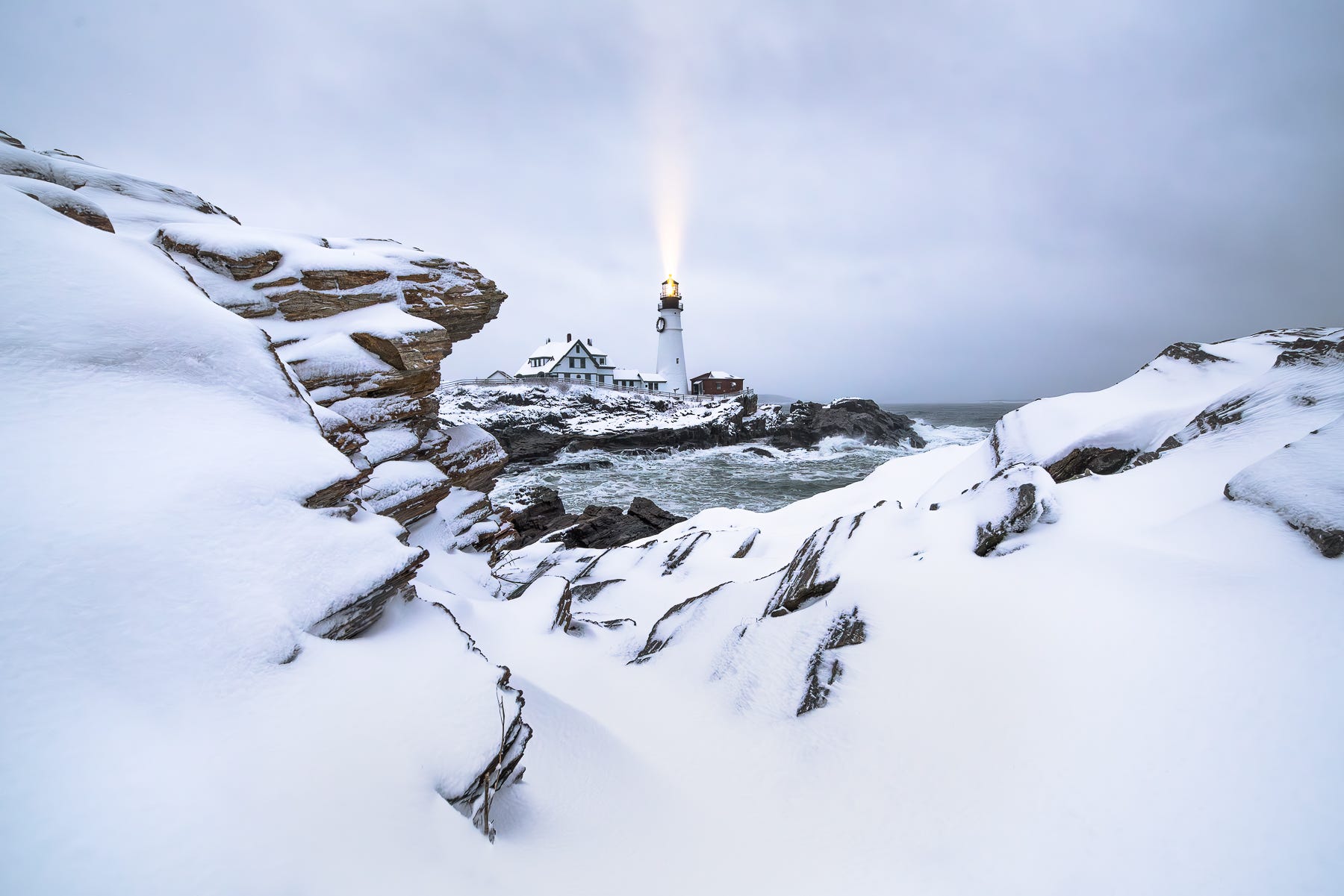 This image of Portland Head Light simply wouldn’t have been possible without snow. It obscured what would have otherwise been distracting lines and colors in the foreground and accentuated the sweeping curve of the rock escarpment framing the lighthouse. Snow in the air caught the beam of light and a fast shutter speed locked it in place.