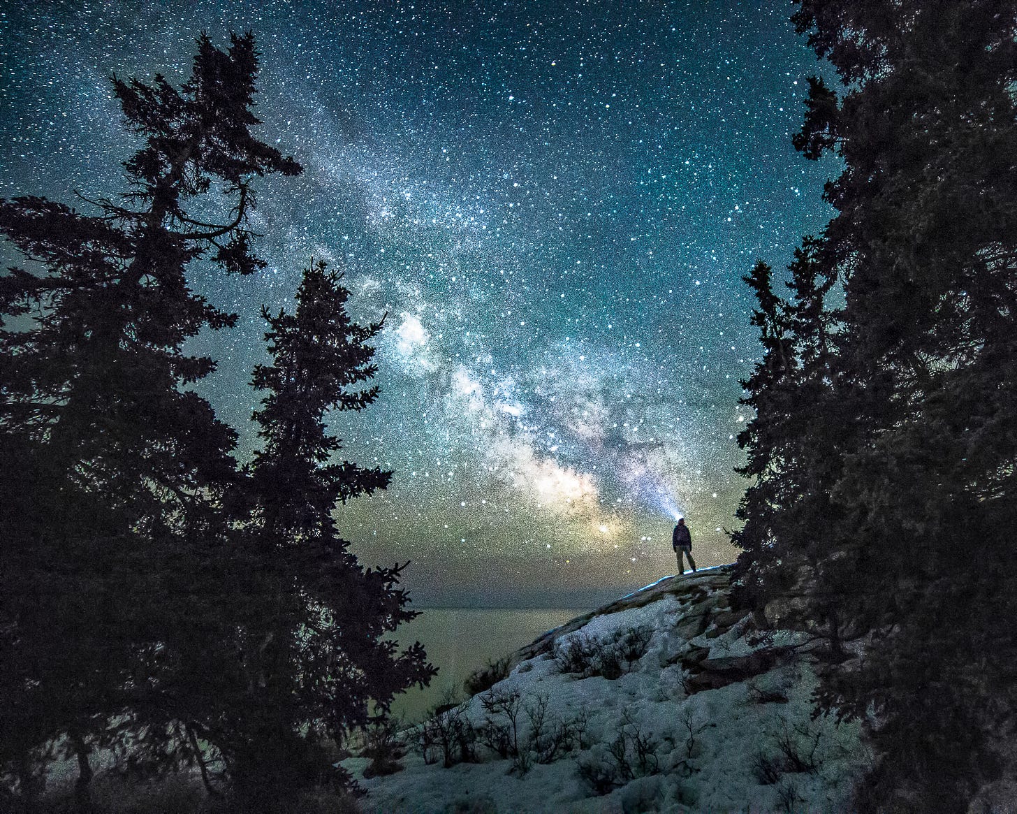 Late winter is the beginning of what’s known as Milky Way Season among serious night photographers. That’s because the core of our home galaxy becomes visible once again after disappearing for a few months below the horizon around the winter solstice. The only time to see this is early in the morning, the wee hours between 2 and 5 AM. I lose a little motivation to get up at these ungodly hours every year, but I have never regretted doing so. The capture above was taken at Reid State Park in Georgetown. Again, a self-timer allowed me to get into the photo myself and pose. The silhouettes of our iconic coastal conifers help make this image extra special. The look huge because of the perspective of an ultra-wide, 14mm, lens.