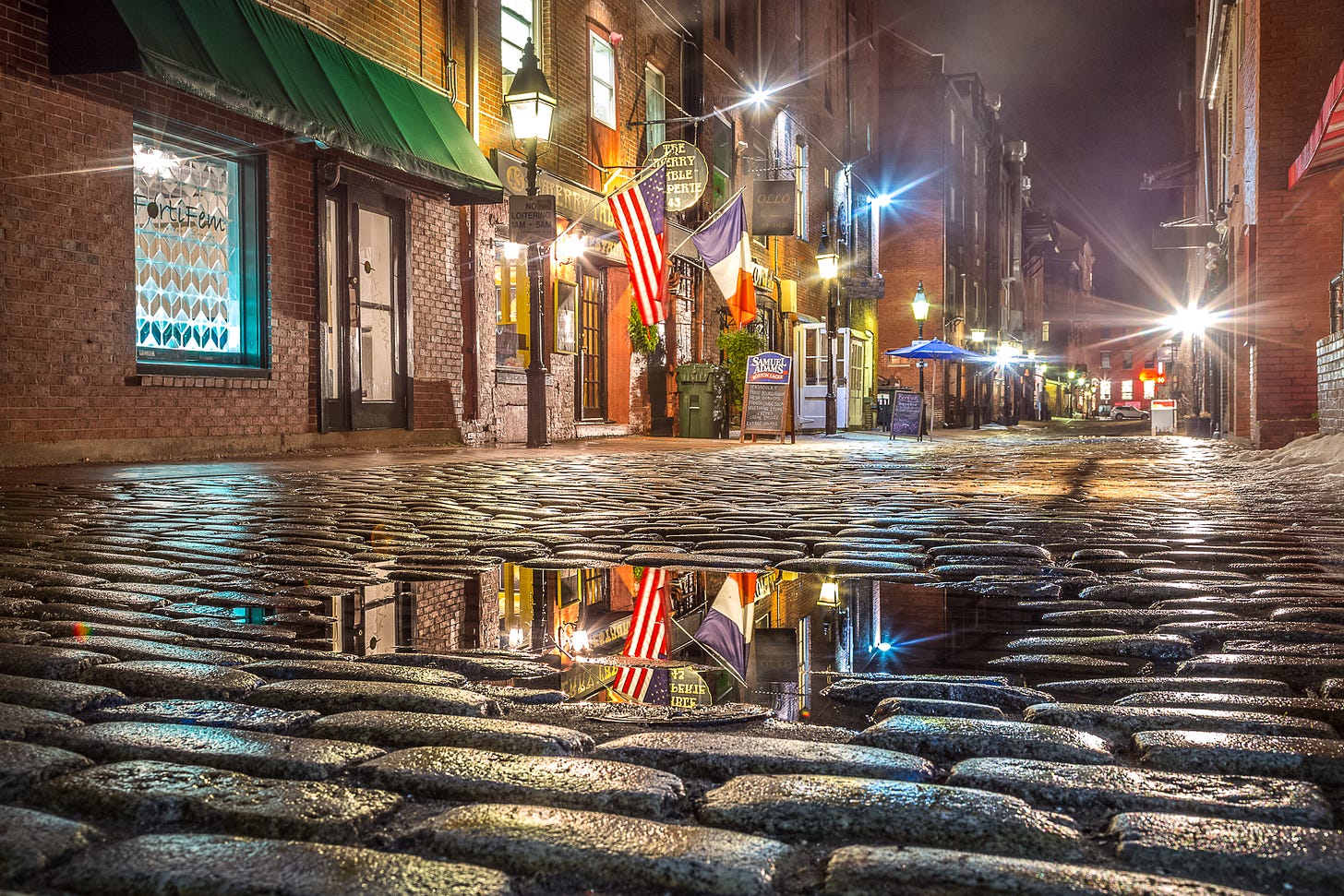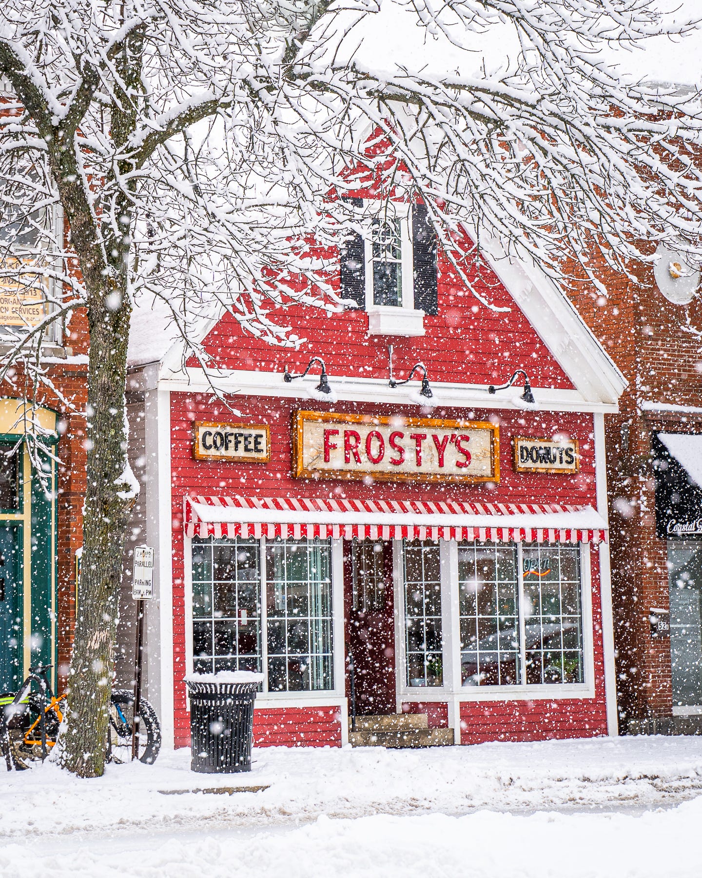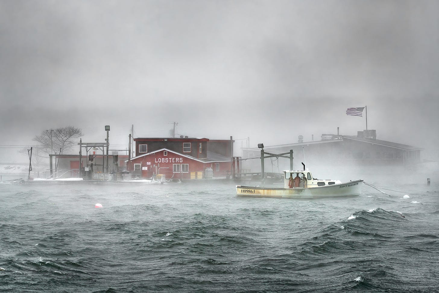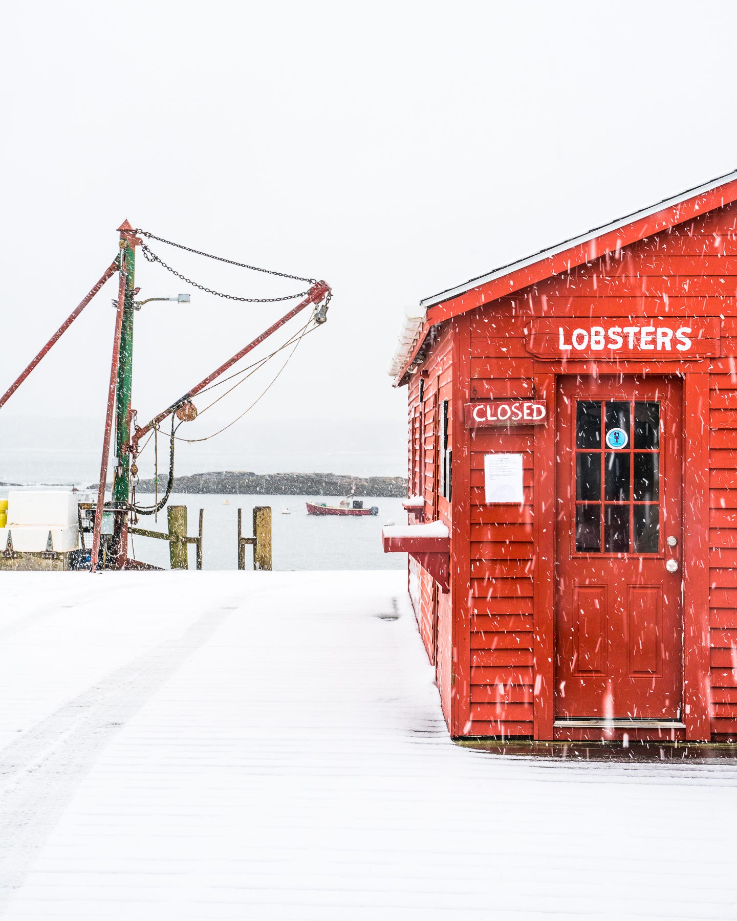 It’s not so much the snow, but the extreme cold that creates the atmosphere that infuses this image of Cook’s Lobster House, taken during a nor’easter. Strong winds whip through the scene, especially evident in the straining flag and whitecaps on the water. The tense atmosphere is electric. I can honestly say that it hurt to stand outside!