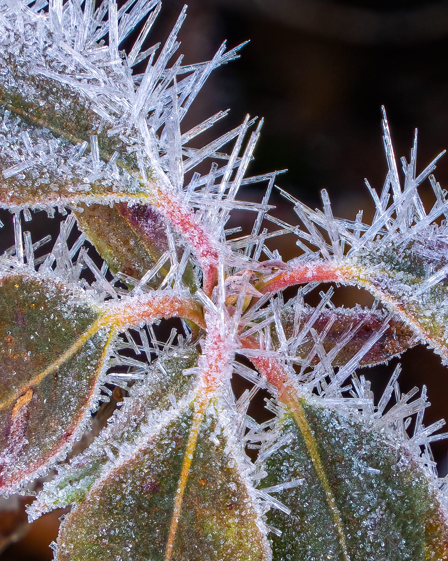 A zoom lens allowed me to get in close on the details of these ice crystals, known as hoar frost, on some small plants in Acadia National Park during our winter workshop there last year.