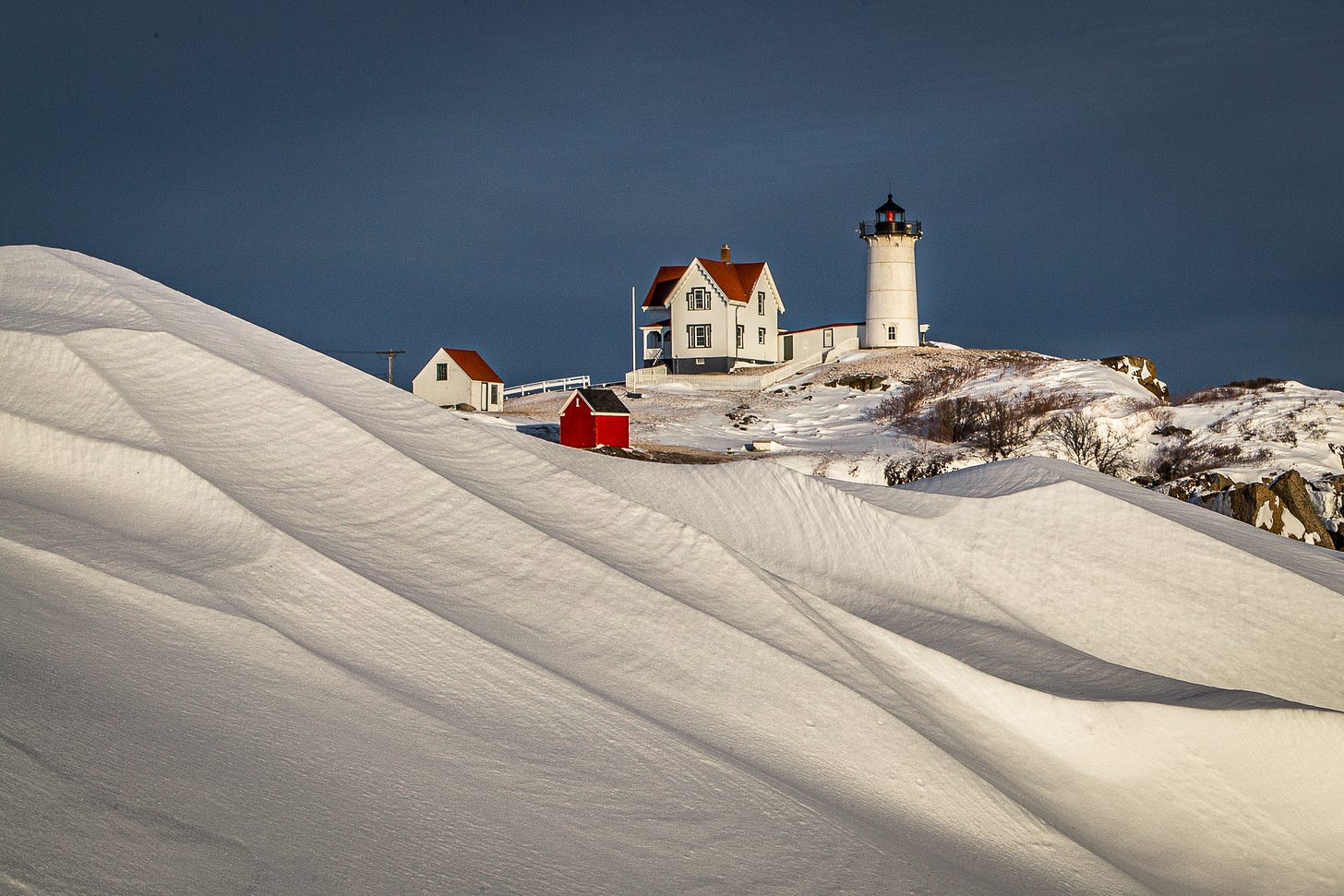 I loved this drift formation on the rocks beneath Nubble Lighthouse. A compressed perspective with a long lens brought these two subjects together and makes it appear as though the Nubble is perched on top of this snowdrift.