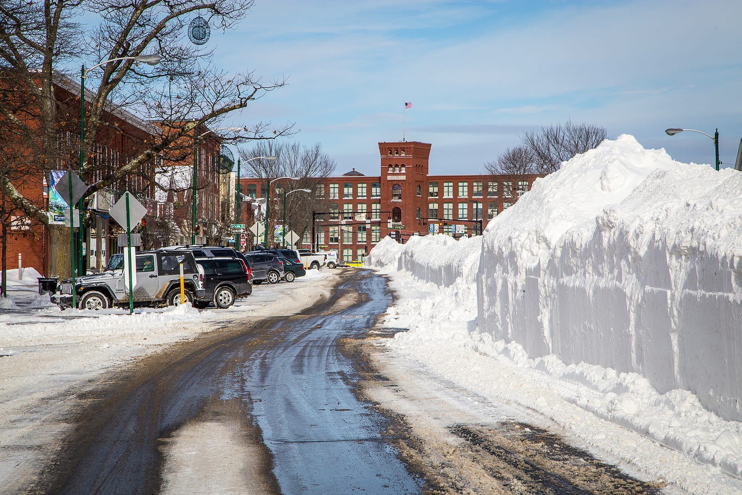 The cleanup after a big storm is fascinating from a human cultural perspective, especially well illustrated in this scene from downtown Brunswick, where the width of Maine Street allows the snow plows to create this giant embankment in the middle of the road after heavy snows.