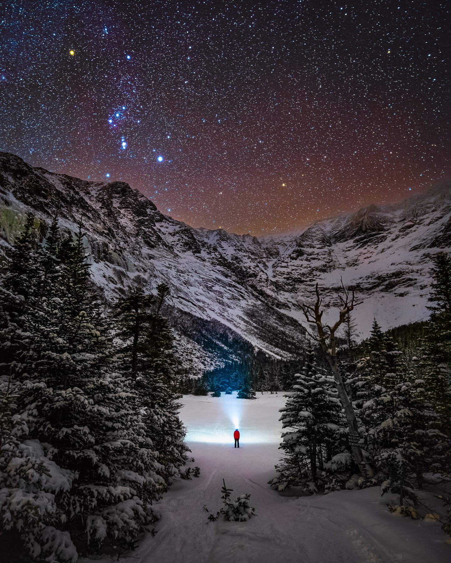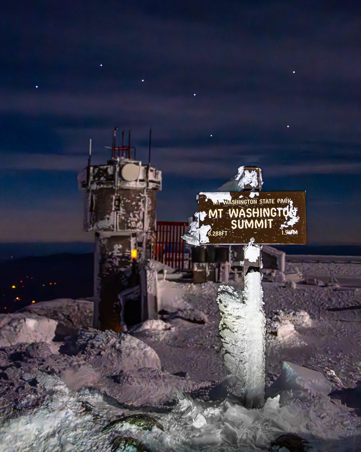 The Mount Washington summit sign is a well-known landmark in New England, thanks to the auto road that brings tourists up here in the warmer months. Seeing it the winter, however, requires a bit more effort and luck. The mountain is known for having the world’s worst weather, and no time is that more true than in winter. We were lucky to have a small window, and summited unplanned after being drawn up here after a sunset shoot on nearby Mount Monroe. I propped my camera on my camera bag and used a headlamp to illuminate the sign, and noticed that the Big Dipper was hanging perfectly above.
