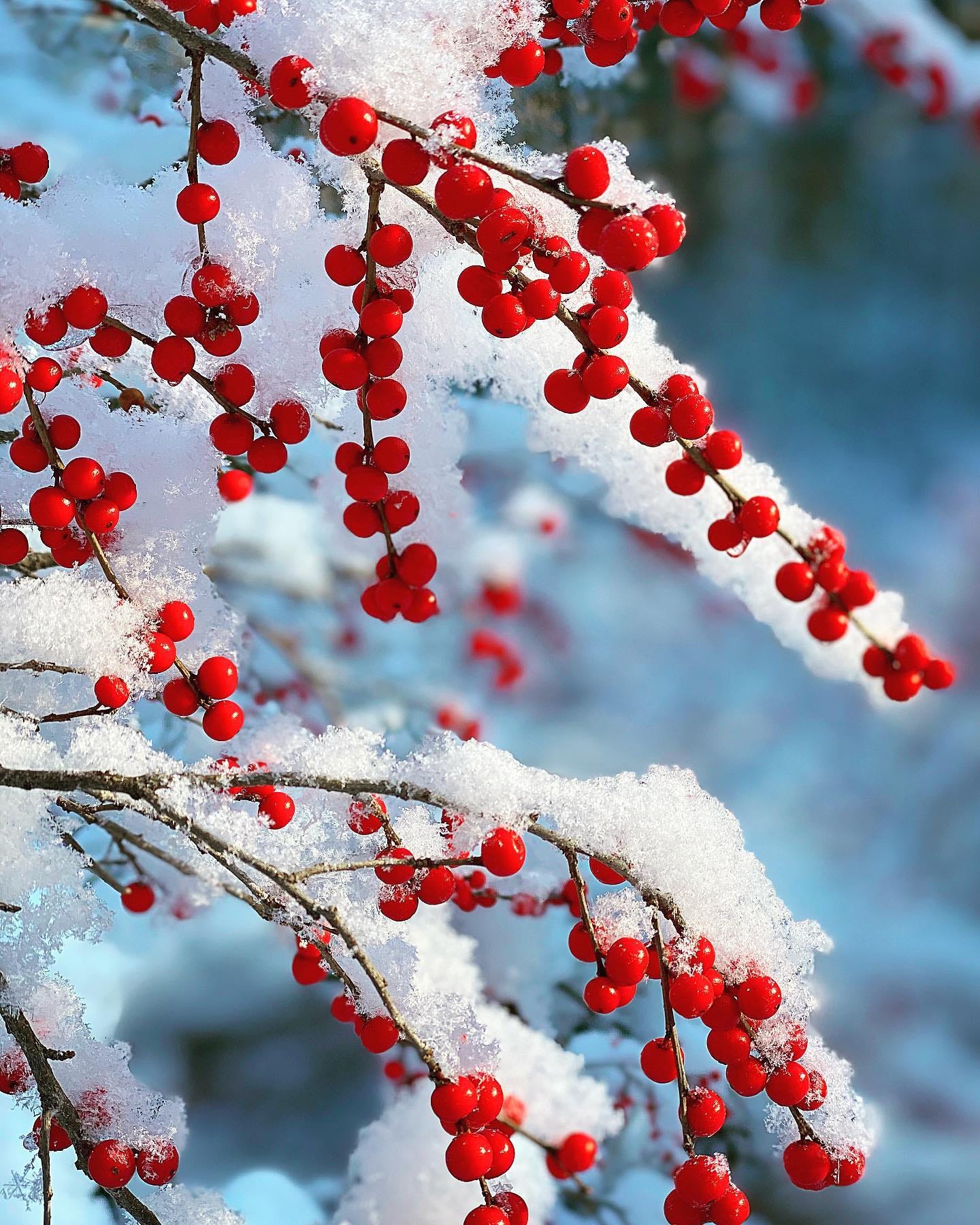 Another winter find, this one seen while out cross-country skiing behind my house, were these winter berries covered in snow. Sunlight shining on them helped separate them from the cool, blue background.
