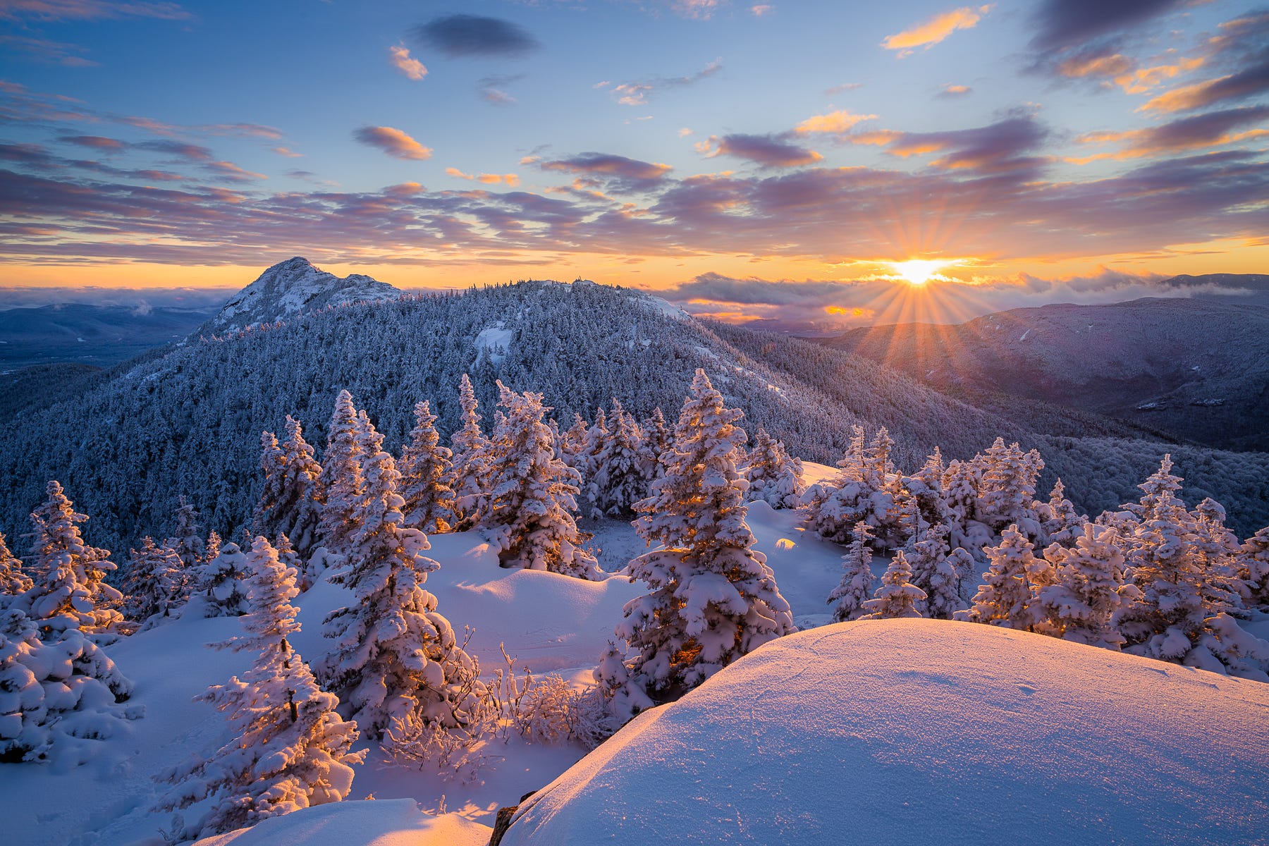Standing on the top of Middle Sister Mountain, looking out at further ridges and Mount Chocorua, surrounded by this stand of snow-covered trees at sunset, is undeniably beautiful. I can’t think of a more perfect representation of what makes being out in nature in the winter more special than this.