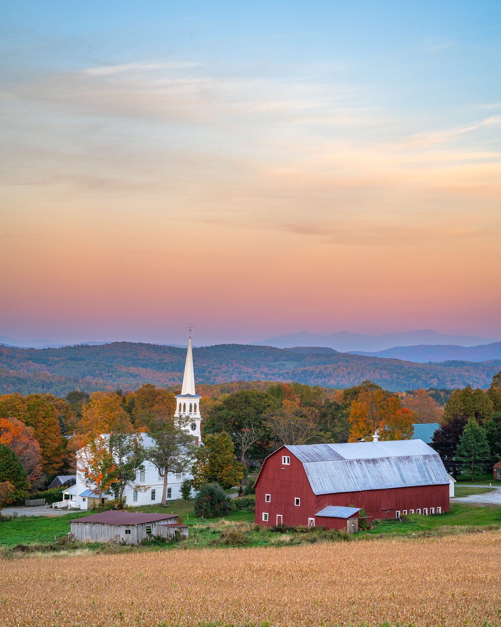 Later that day, we couldn’t pass up making an image of this classic, though oft-photographed, scene from Peacham, Vermont, as the sun set behind us and the Band of Venus, or changing spectrum of light on the horizon from earth’s shadow, advanced over the horizon. We heard that the farmers left the cornfield for the photographers. Thank you!