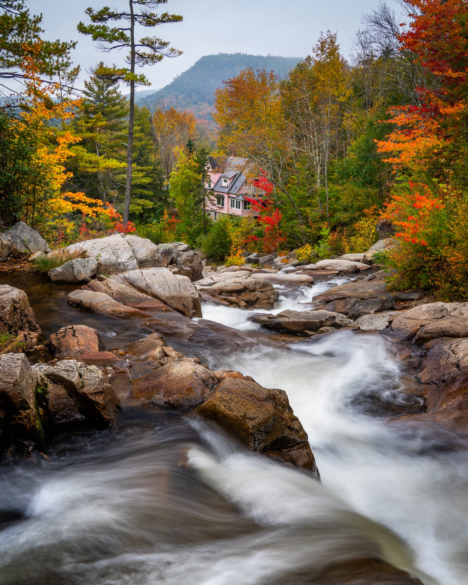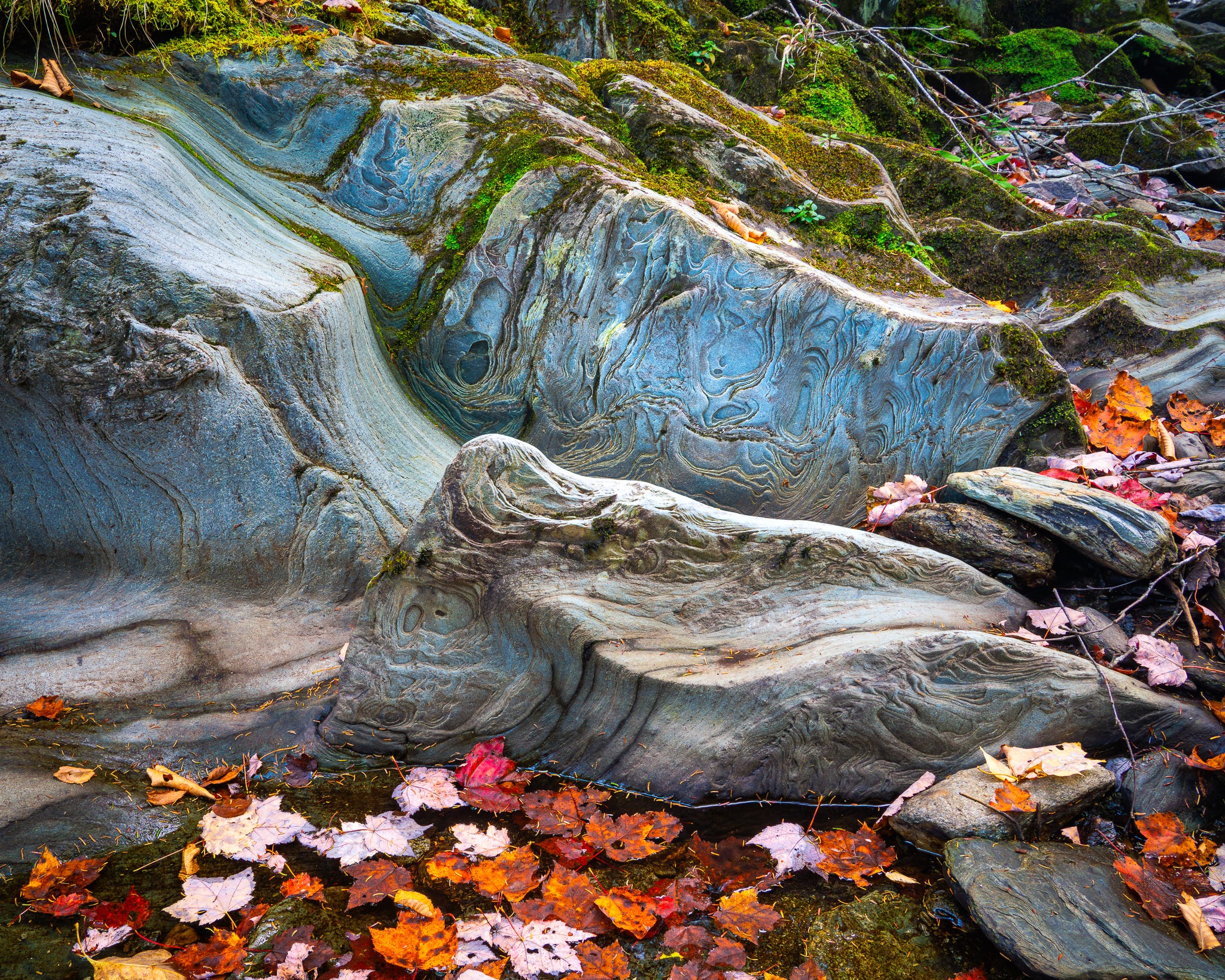 I kicked things off co-leading a photography workshop focused on Vermont fall foliage with Kurt Budliger. For the next 4 days, us and 10 attendees traveled to some well-known, but mostly lesser-known locations, where we witnessed the beauty and timelessness of the New England fall season. The very first stop on the first night of the workshop was a series of cascades along a stream near Kurt’s house. After working with students along different sections of cascades, I stumbled on this blue swirling pattern in the granite and decided I had to pull out my camera to make a photo.