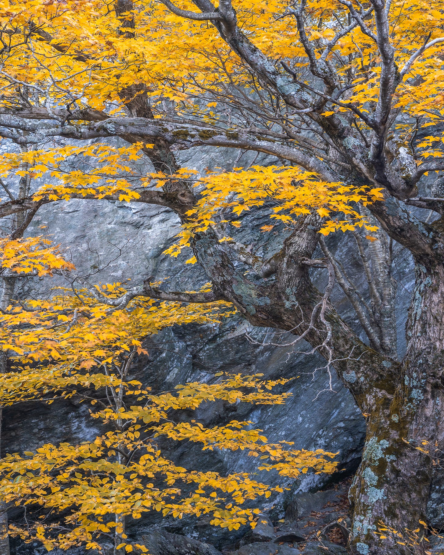 From there we made our way up to Stowe, and instead of trying to photograph barns or churches, we went straight into Smuggler’s Notch to try to capture the magic of the incredible mountain forest there. This type of photography is HARD. I think there is great joy in making sense of the chaos, but make no mistake, it’s not easy. I came away with these two images that focus on the design that’s possible when you think of the tree branches and colors in a graphic sense.